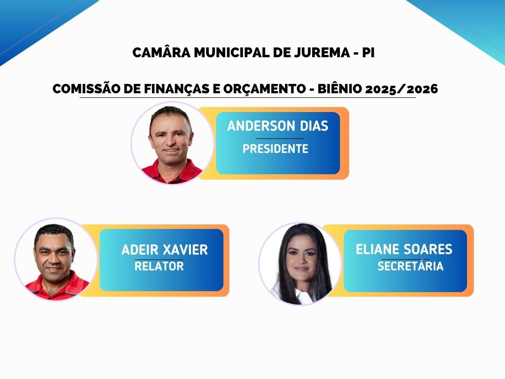 A Câmara Municipal de Jurema, no estado do Piauí, divulgou oficialmente a composição da nova Comissão de Finanças e Orçamento, que atuará no biênio 2025/2026. Essa comissão é responsável pela análise das peças orçamentárias, acompanhamento da execução financeira do município e fiscalização das contas públicas.