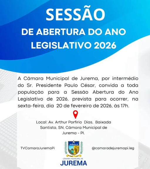 A Câmara Municipal de Jurema, por intermédio do presidente Paulo César, convida toda a população para participar da Sessão de Abertura do Ano Legislativo 2026, momento que marca oficialmente o início dos trabalhos parlamentares no município.